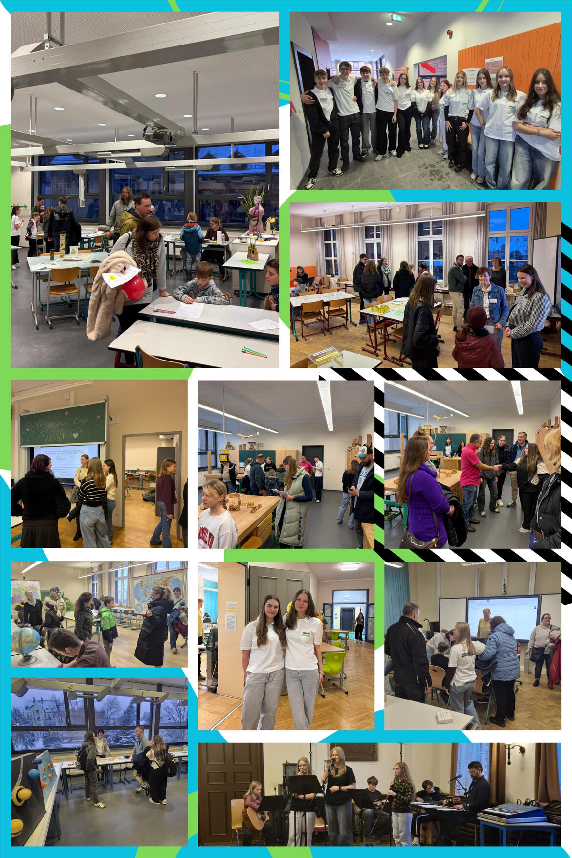 In der 2. Etage luden die Schülerinnen und Schüler der Klasse 10b im liebevoll gestalteten Schülercafé zu Kaffee und Kuchen ein. In den Fachkabinetten konnten Besucher spannende Einblicke in die Welt der Physik und Chemie gewinnen. Für eine stimmungsvolle Atmosphäre sorgten Auftritte unserer Schülerband sowie der Tanzgruppe der 5. und 6. Klassen in der Aula. Im Fachbereich Musik hatten die Kinder außerdem die Möglichkeit, verschiedene Instrumente selbst auszuprobieren. Ergänzend informierte die Schulsozialarbeit über ihre wichtige Arbeit an unserer Schule.